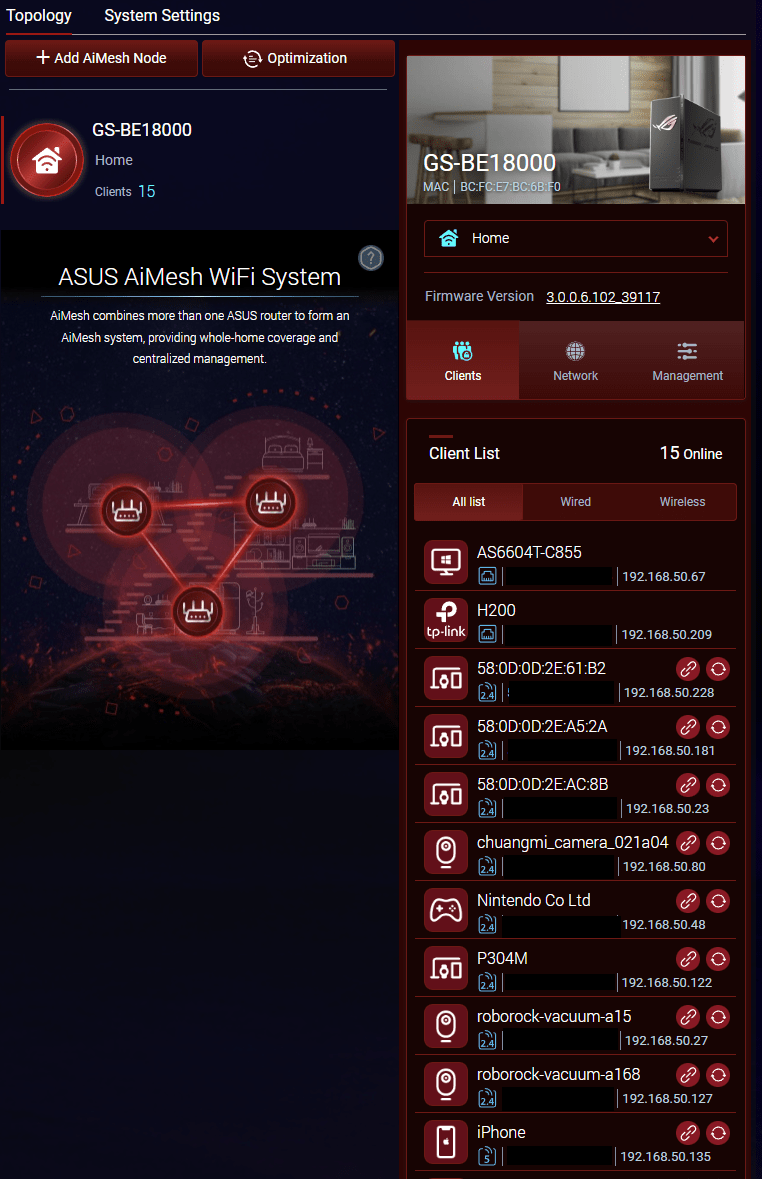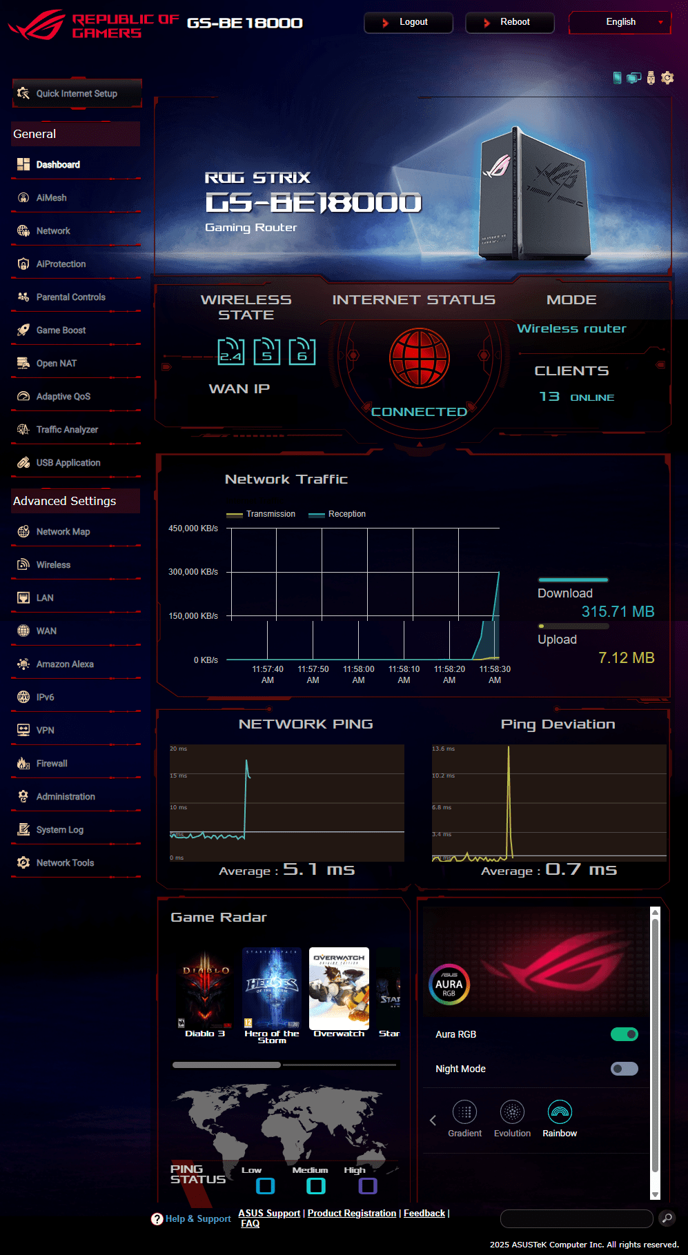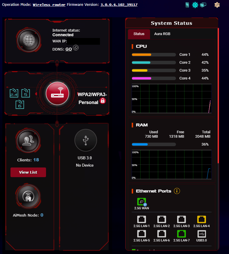 The ROG router’s web GUI differs from that of standard ASUS routers, as it features an additional ROG Dashboard. This dashboard provides a comprehensive display of all network information and gaming modes, offering a more tailored and immersive experience for gamers.
