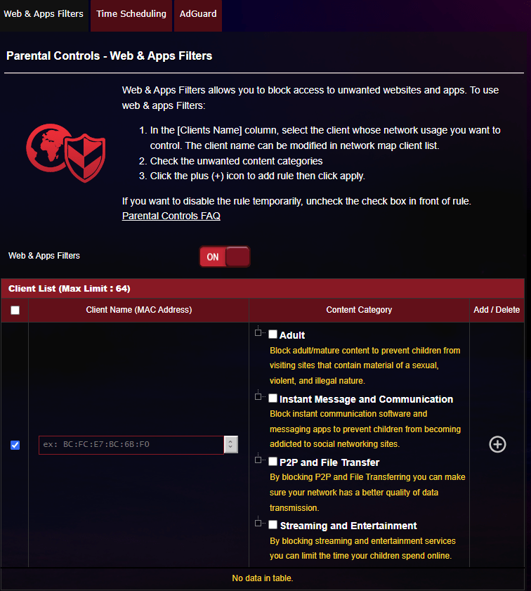 We tested the Parental Controls feature, and while it generally works well, the Adult content filtering is not entirely effective, with some websites not being blocked as expected. However, the controls do allow you to adjust the time and date settings for individual devices, providing flexibility in managing internet access schedules.