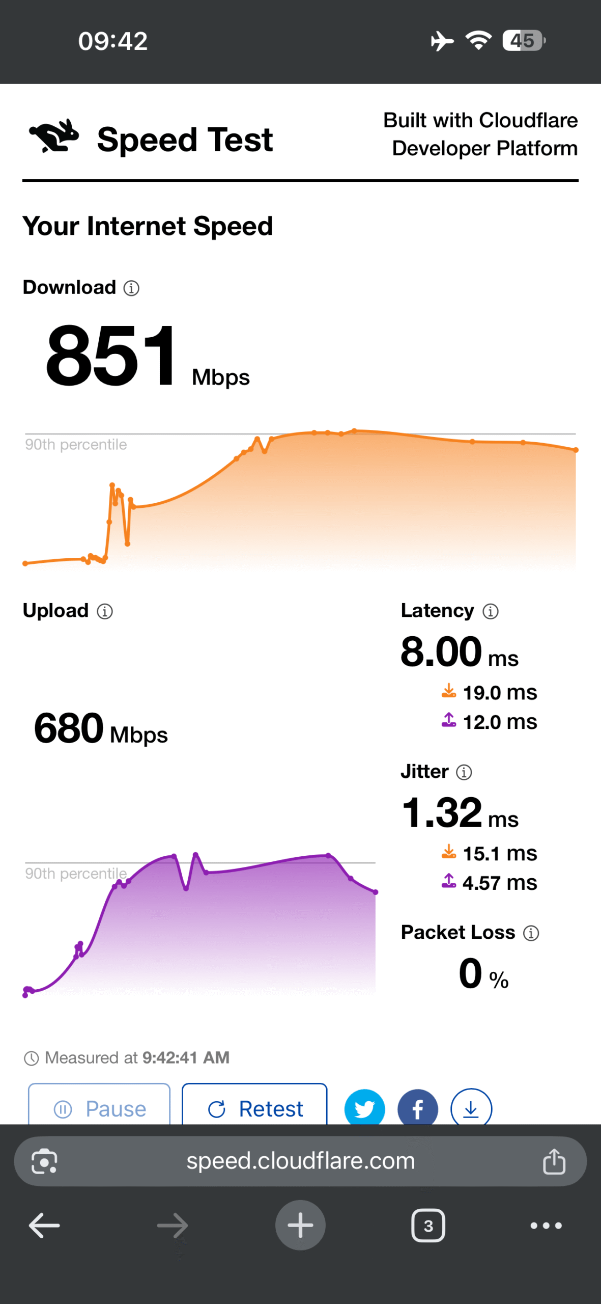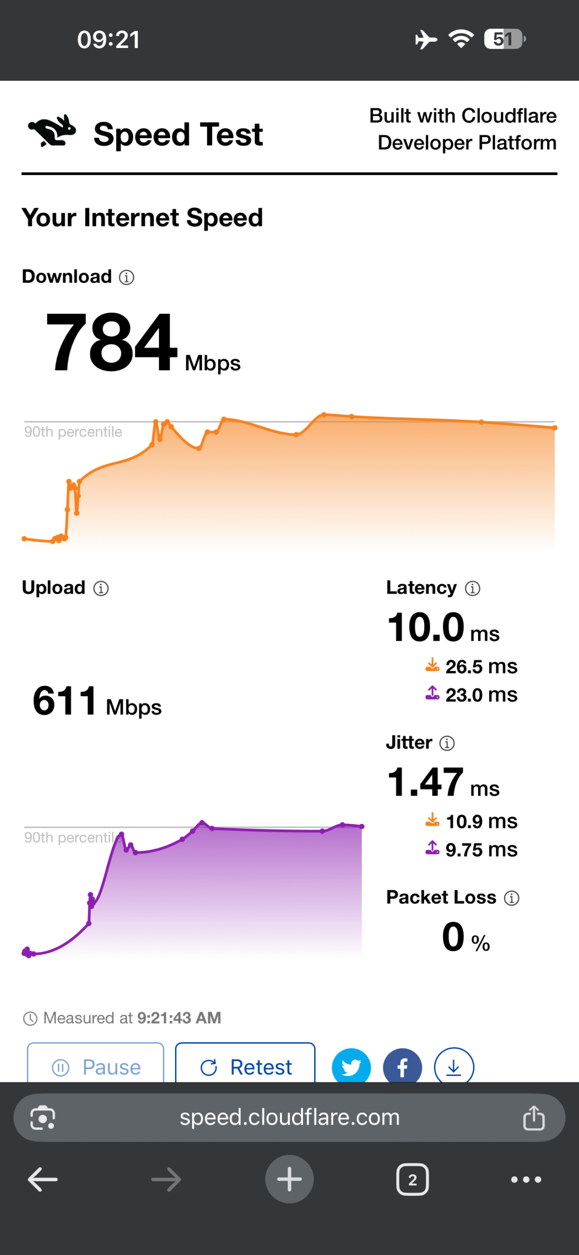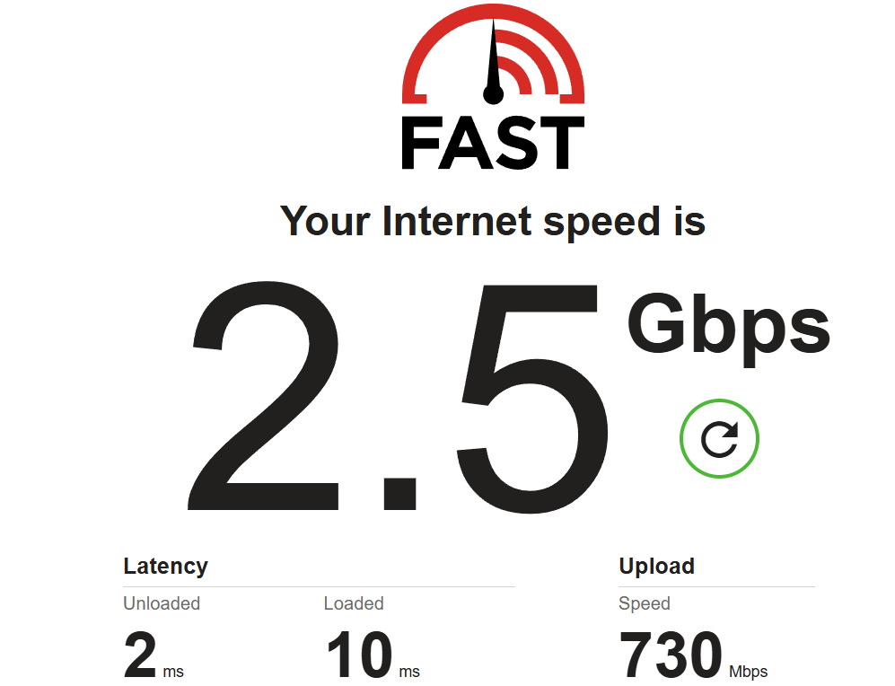 We are using an M1 2.5Gbps internet connection, and this benchmark was conducted by testing the connection directly from the router to the internet.