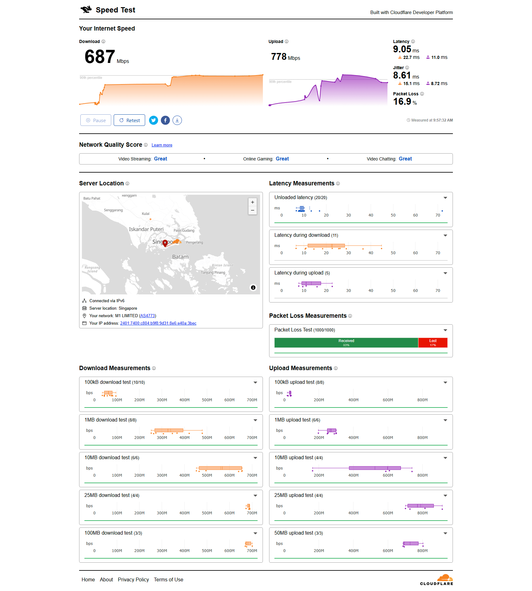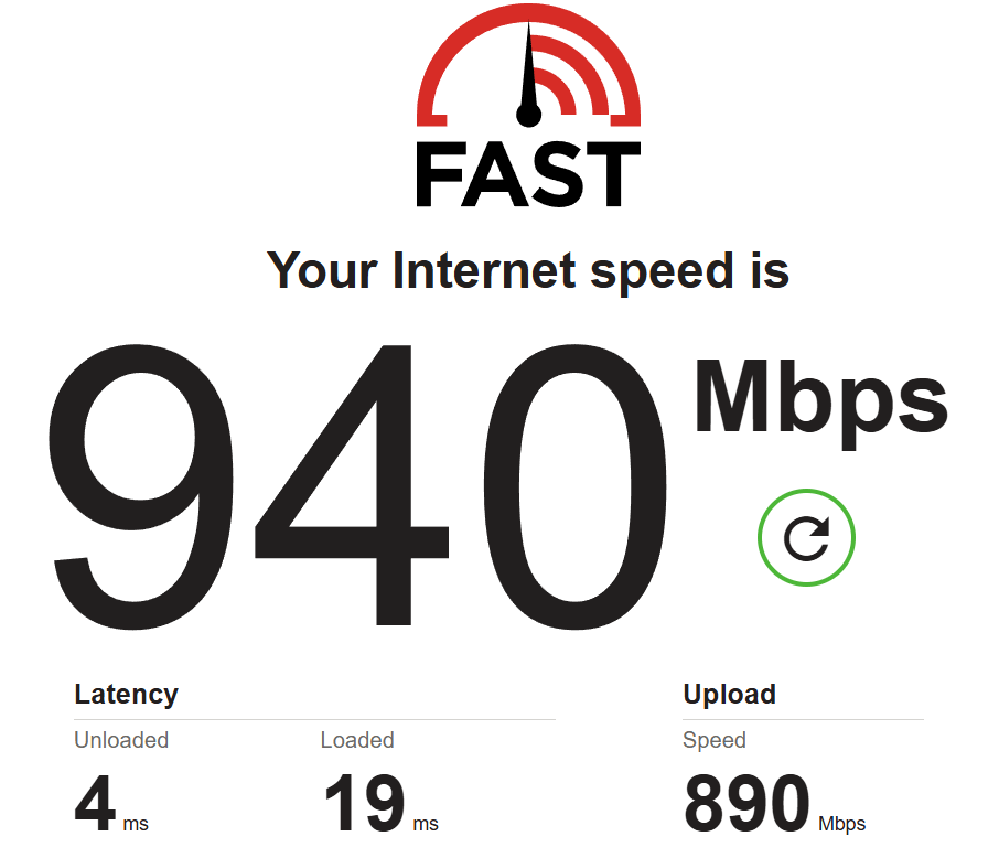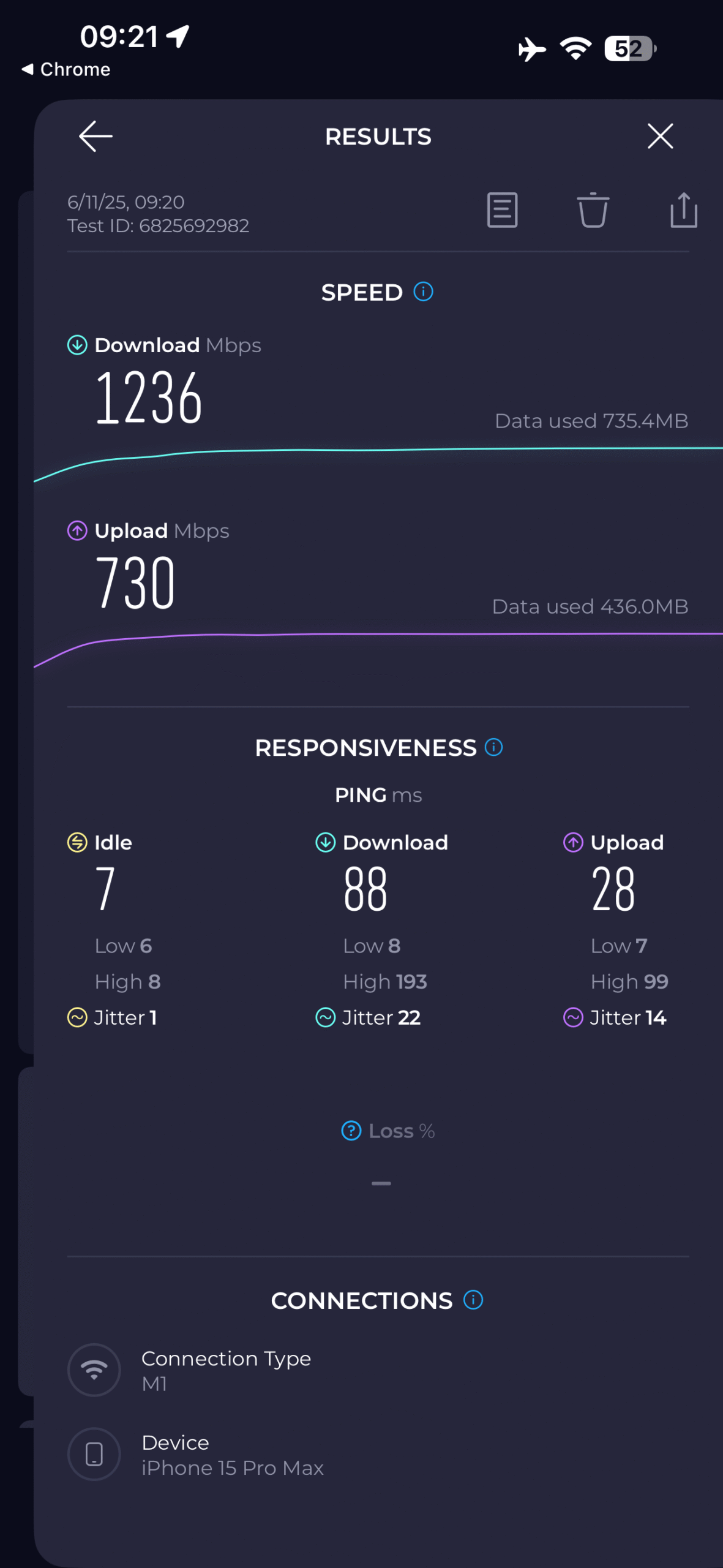 We are using an M1 2.5Gbps internet connection, and this benchmark was conducted by testing the connection directly from the router to the internet.
