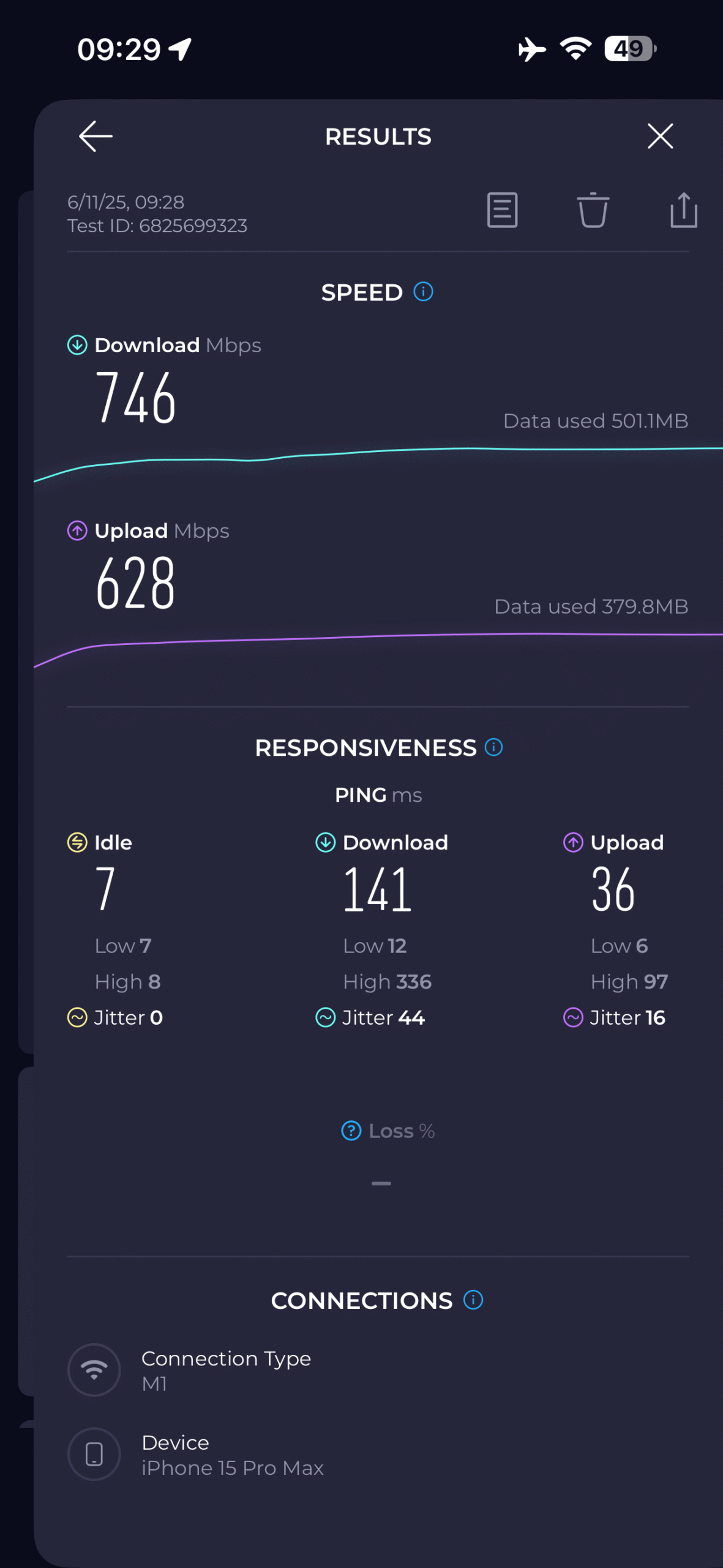 The benchmark test results below were obtained in the living room, positioned 5 meters away from the router.
