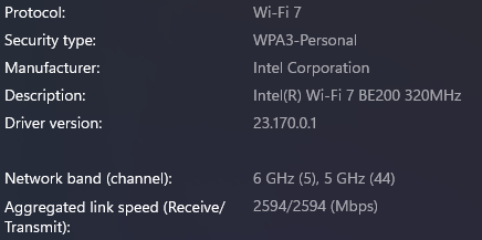 | Wireless chip | Intel BE200 Driver 23.170.0.1 |