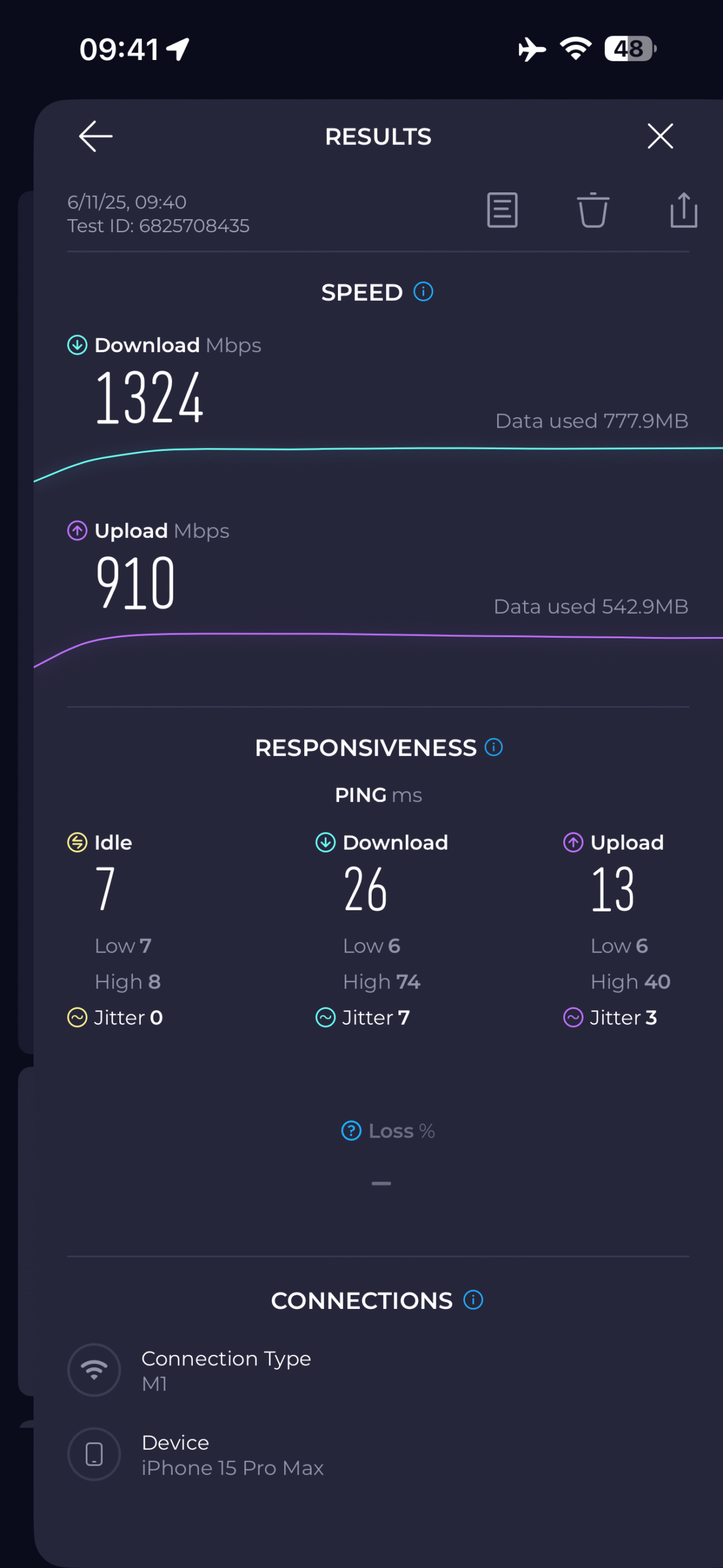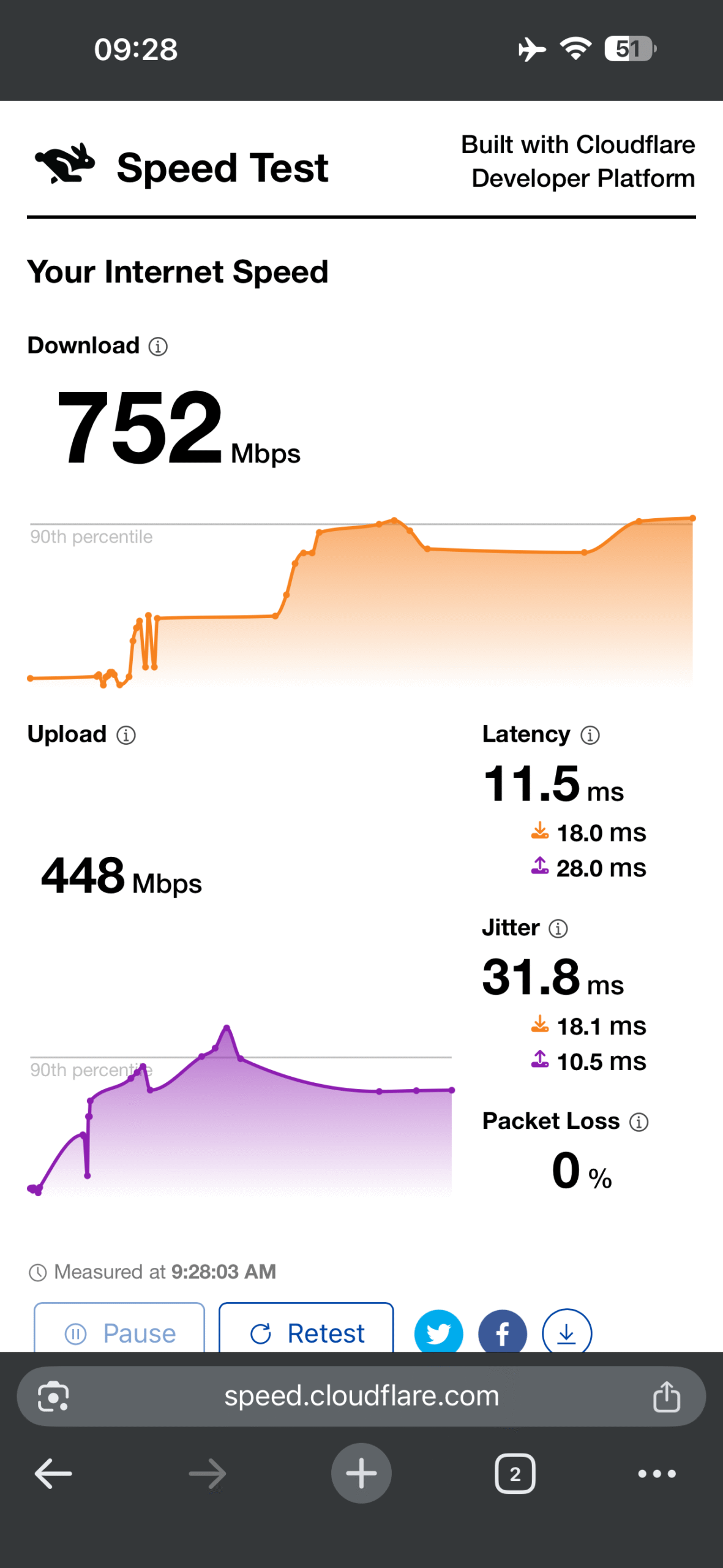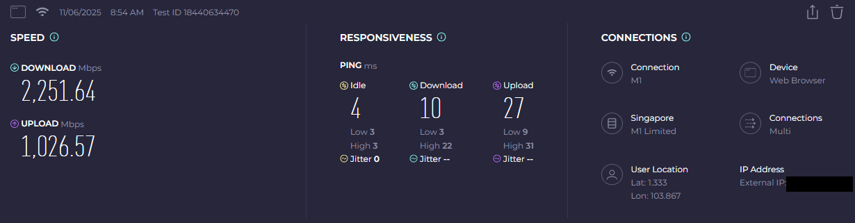 We are using an M1 2.5Gbps internet connection, and this benchmark was conducted by testing the connection directly from the router to the internet.